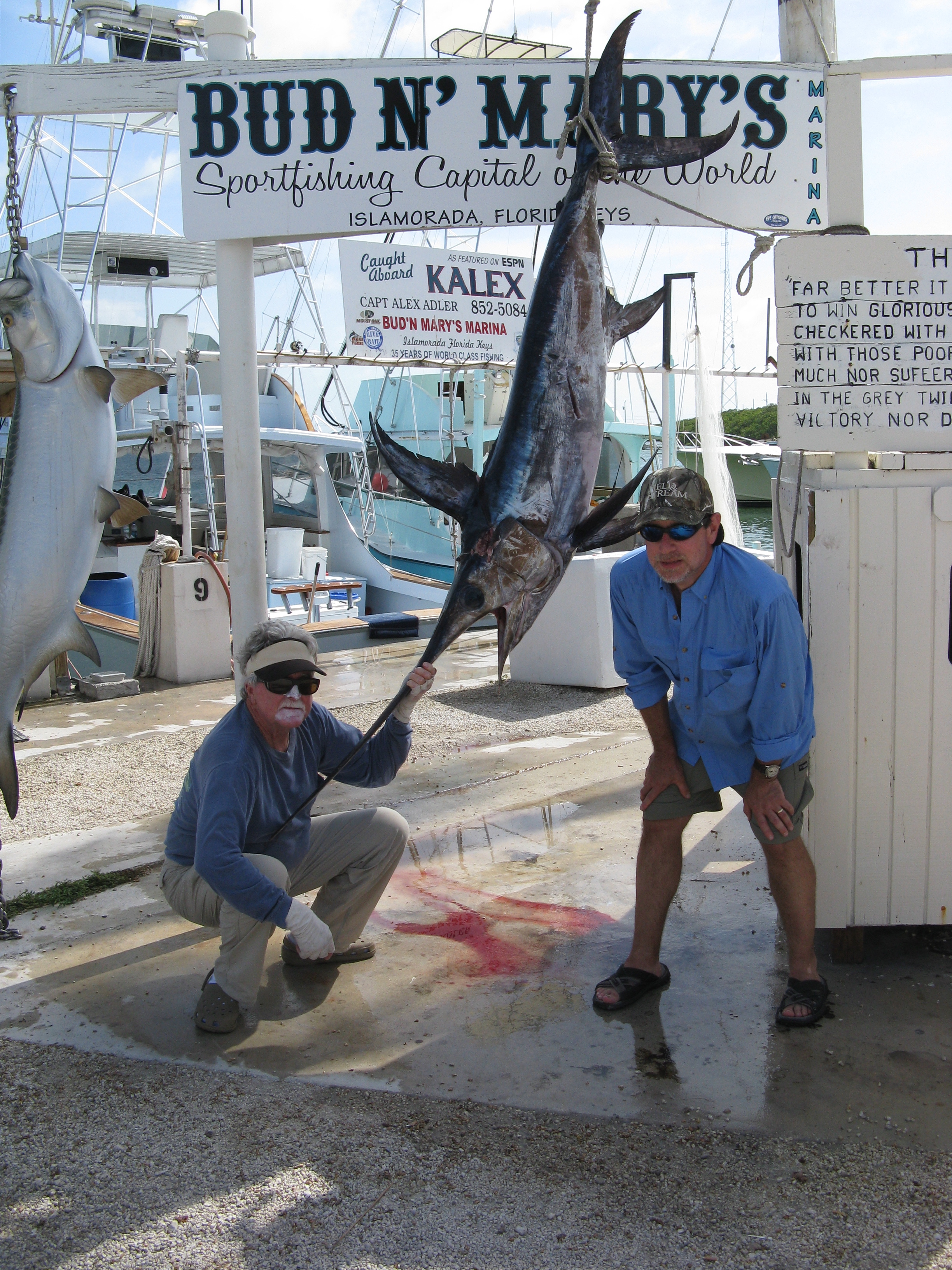 Richard Stanczyk, owner of Bud N’ Mary’s, and I pose with my swordfish back at the dock.