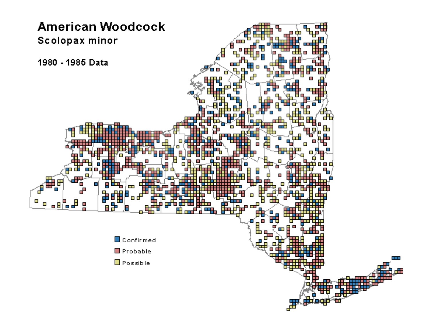 Schiavone sent me maps that recorded woodcock sightings throughout New York State from 1980 to 1985 and again from 2000 to 2005. Neither map notes birds seen on Manhattan, but Staten Island—which lies directly southwest of the city, just across New York’s Upper Bay, home to Ellis Island and the Statue of Liberty—is covered with sight denotations.