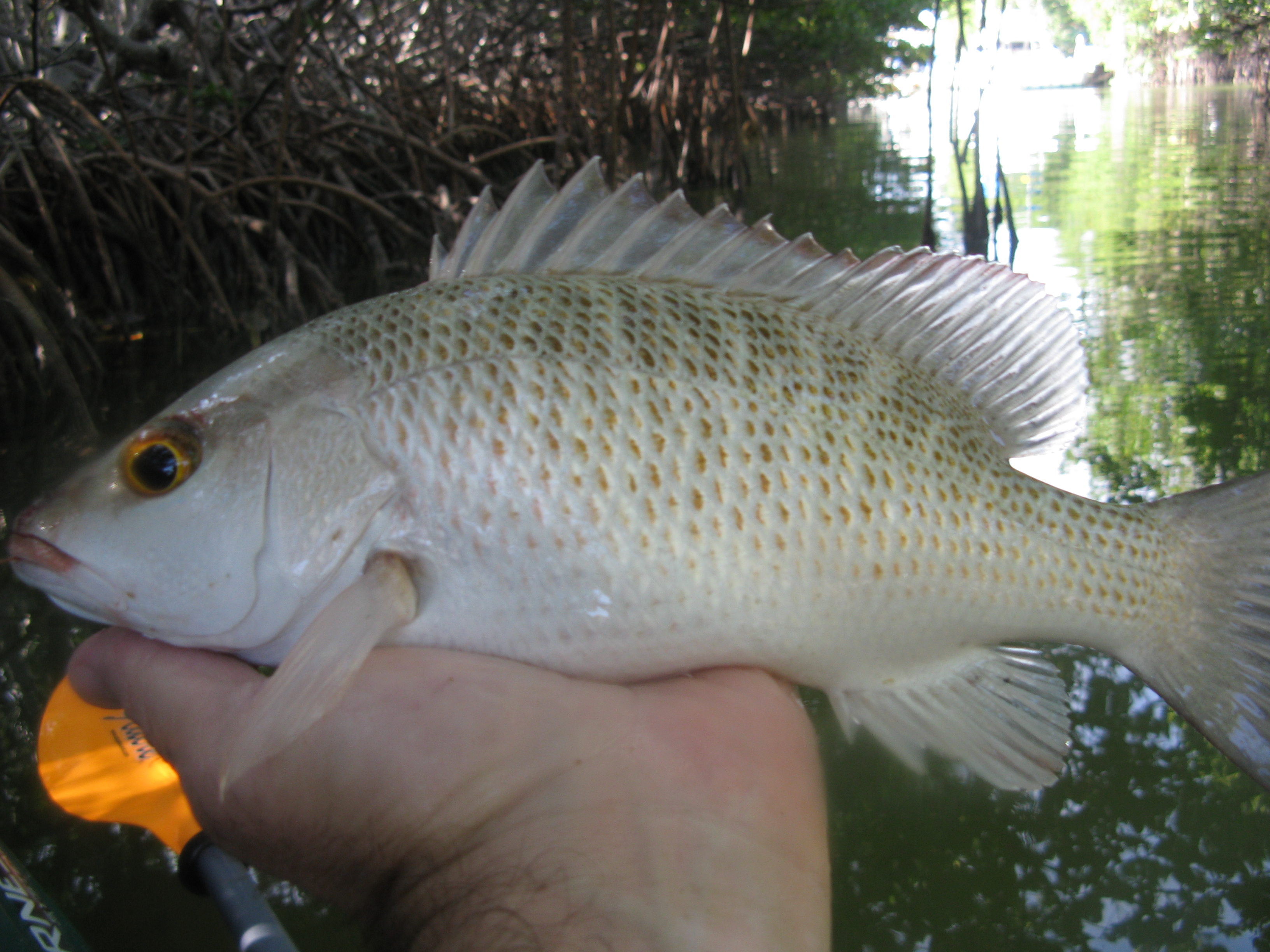 A pretty mangrove snapper from a mangrove creek. These fish will exhibit varying colorations depending on their habitat.
