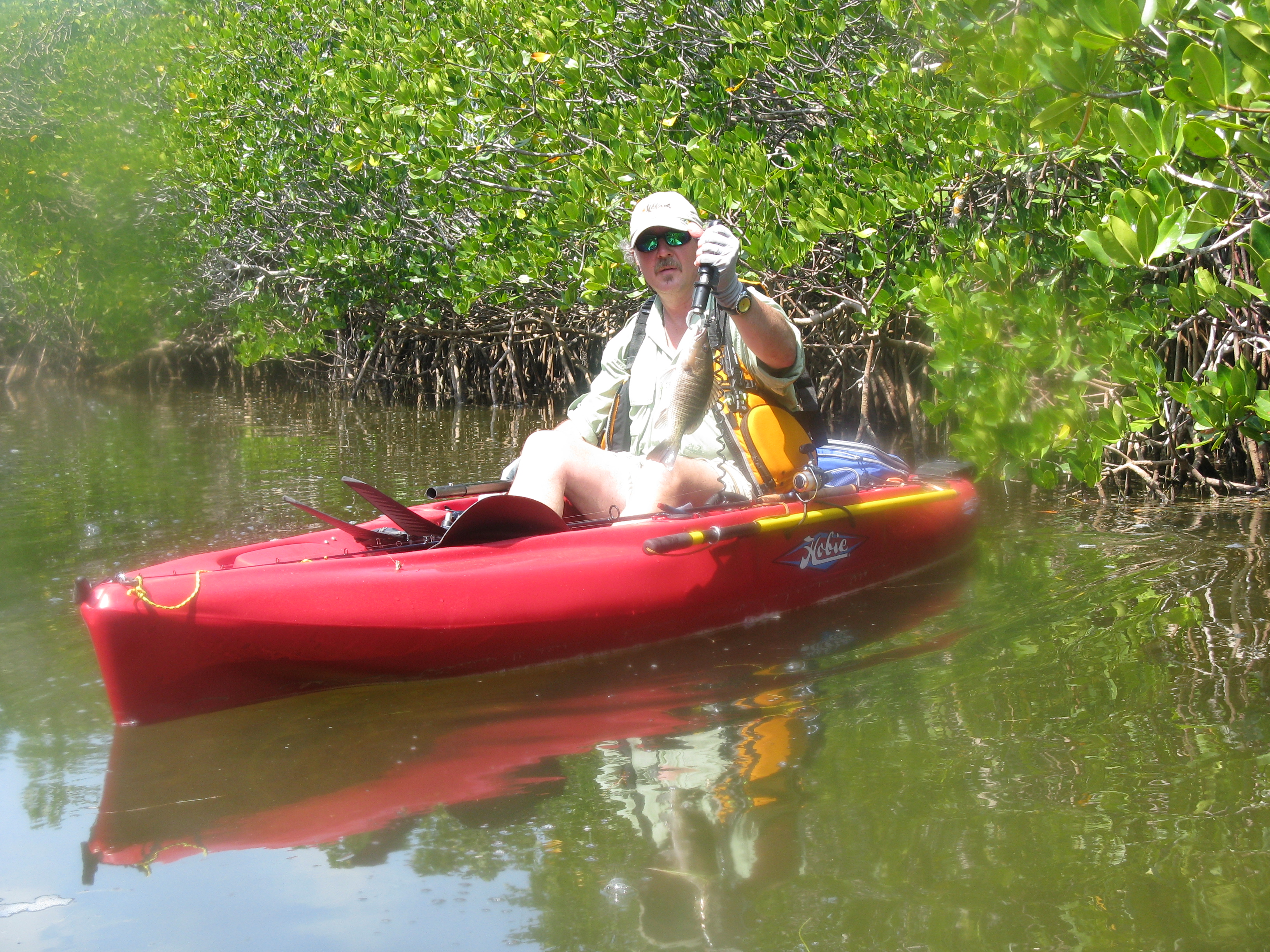We put a few keeper-size yellowtails in the kayaks, then the mangroves start biting again. John, however, wants to find his lost flag, so he pedals out to the midsection of the old bridge where the water is a bit rougher and the current somewhat stronger. Fifteen minutes later he comes pedaling back.