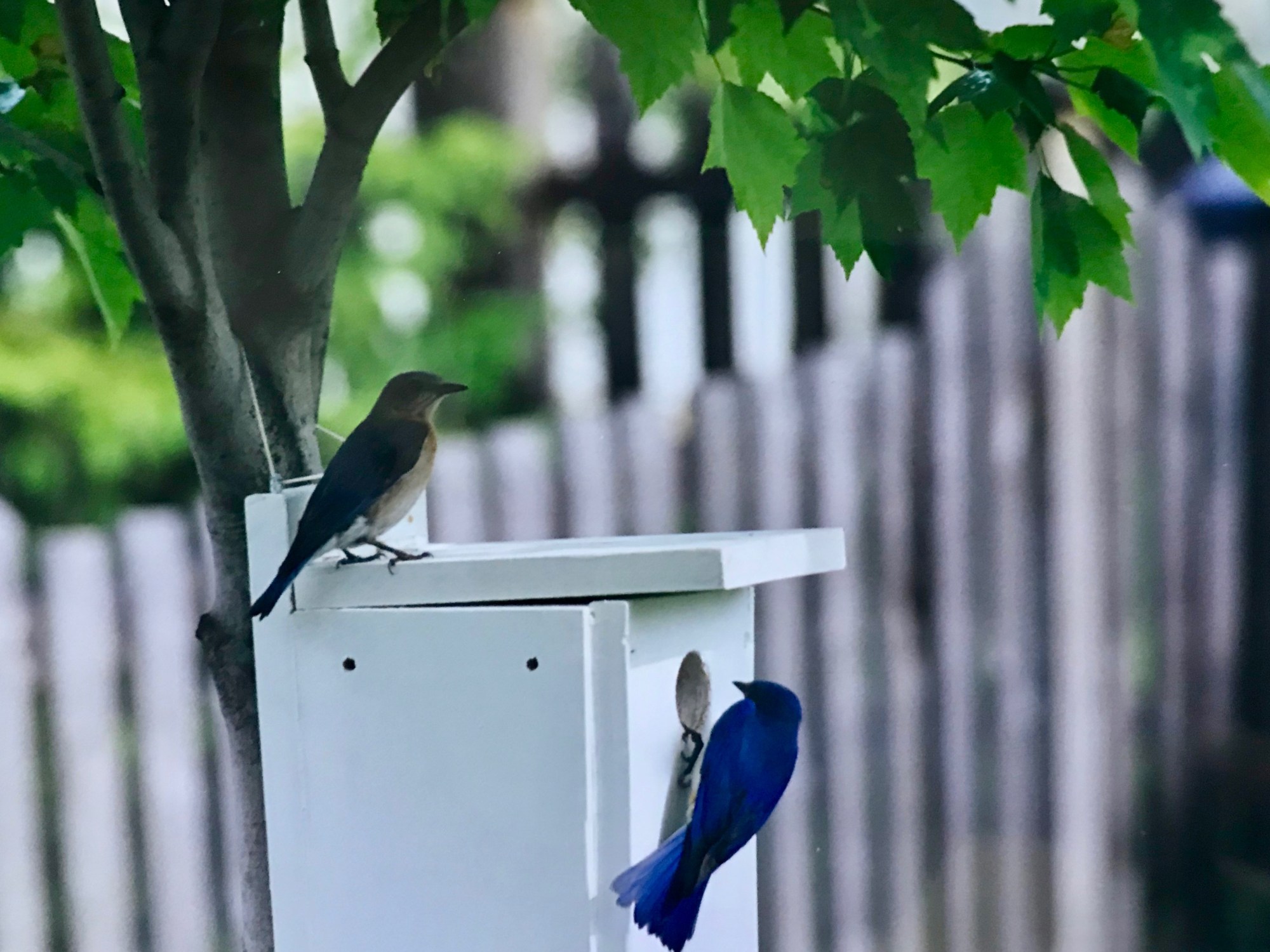 After we hung our bluebird box, the four of us spent a lot of time with our noses pressed against the window behind the TV, watching the bluebirds gather grass and straw for their nest, ward off other small birds that were interested in brooding there, and gathering food for their nestlings from sunrise to sunset. Occasionally, when both the male and female were out of sight, we’d dart out the back door and lift the roof of the box to examine the nest, the eggs, and later, the nestlings. One evening the four of us sat silent and almost motionless on the patio as the female, after eying us for what seemed like an hour, flew down from the box to gather some mealworms—prime bluebird food—that we had placed on the ground just a few feet away from us.